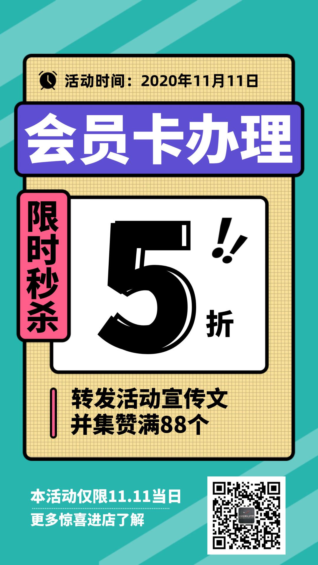 转发本文并集赞满88个,“双11”全品类年卡当日进店办理缴费即享受5折优惠;单次游泳健身体验券更有6.8折享受。