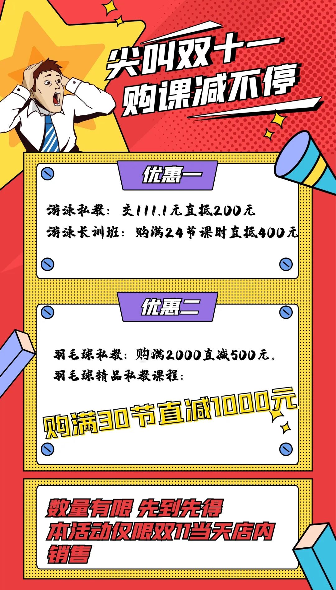 羽毛球私教课:购满2000元直减500元,购满30节直减1000元。