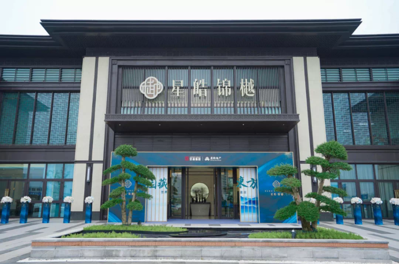 抬眼看去,大气尊贵的门头瞬间映入眼帘,深蓝的主色调流露出艺术美学的盛景,门外还驻立着两株硕大的景观树,四周清净且幽静。正瞧着,星皓·锦樾营销中心的置业顾问王腾飞就上前热情地将我们引到了大厅内。